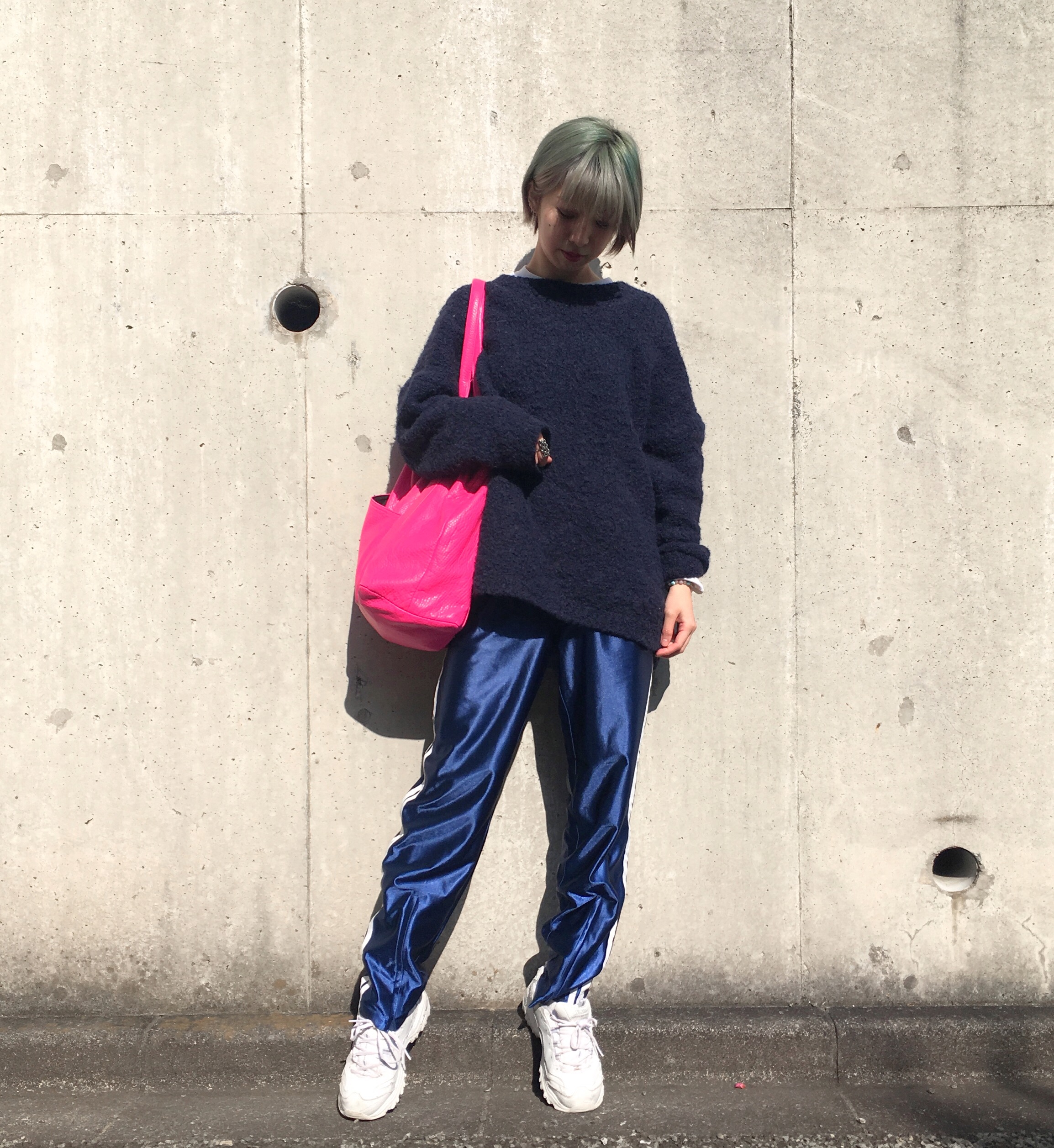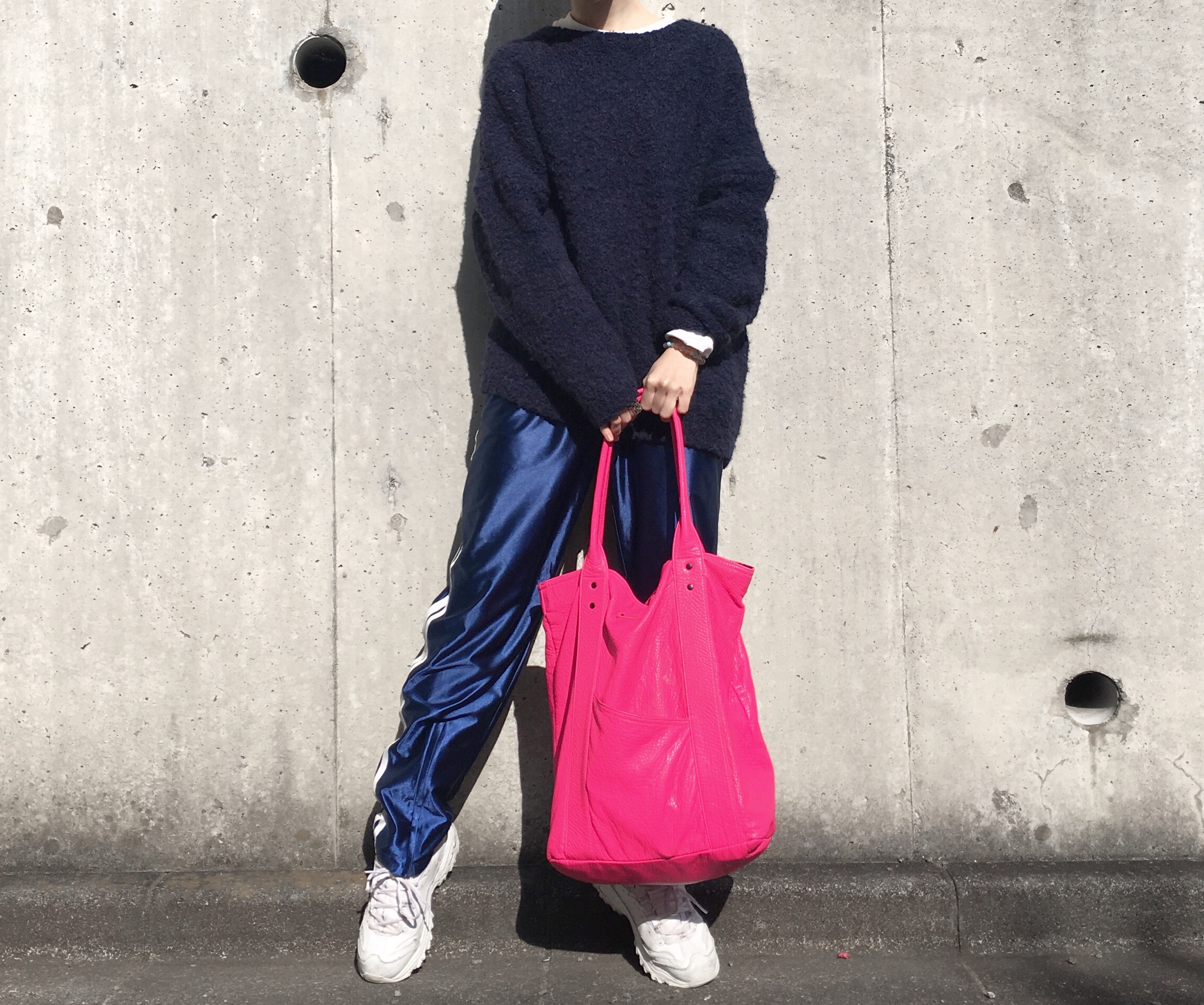 ショッキングピンクのバッグをプラス。