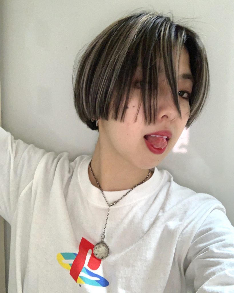 ハイライト状に明るい髪色を残し、