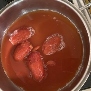 私はトマトベースが好きなので、トマト缶。そしてローリエ、クコの実、ナツメ、八角、鷹の爪、花椒、五香粉、シナモン、豆板醤、四川風の何かの調味料、ペッタンの元。これを混ぜ混ぜ、韓国の火鍋屋さんで食べた味になりました!!