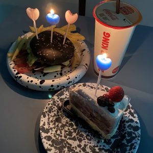 これは、大好きなハンバーガーをケーキに見立てて晩餐✨
