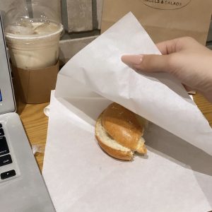 (これは、仕事の休憩時間にベーグル食べながら課題してる様子。現代百貨店の地下1階のベーグルショップ美味しいよ!)