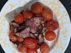 トマトと鴨を炒めただけのやつですが、お皿かわいいとこましに見えませんか?