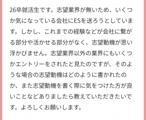 というか、逆に私の場合、むしろ、「〜〜こういう経験をしてきたので活かしたくて志望してます」という書き方だったら、あまり通過してなかったイメージ。(もちろん、専門性が必要な業種の場合はいると思うのですが・・・・)
