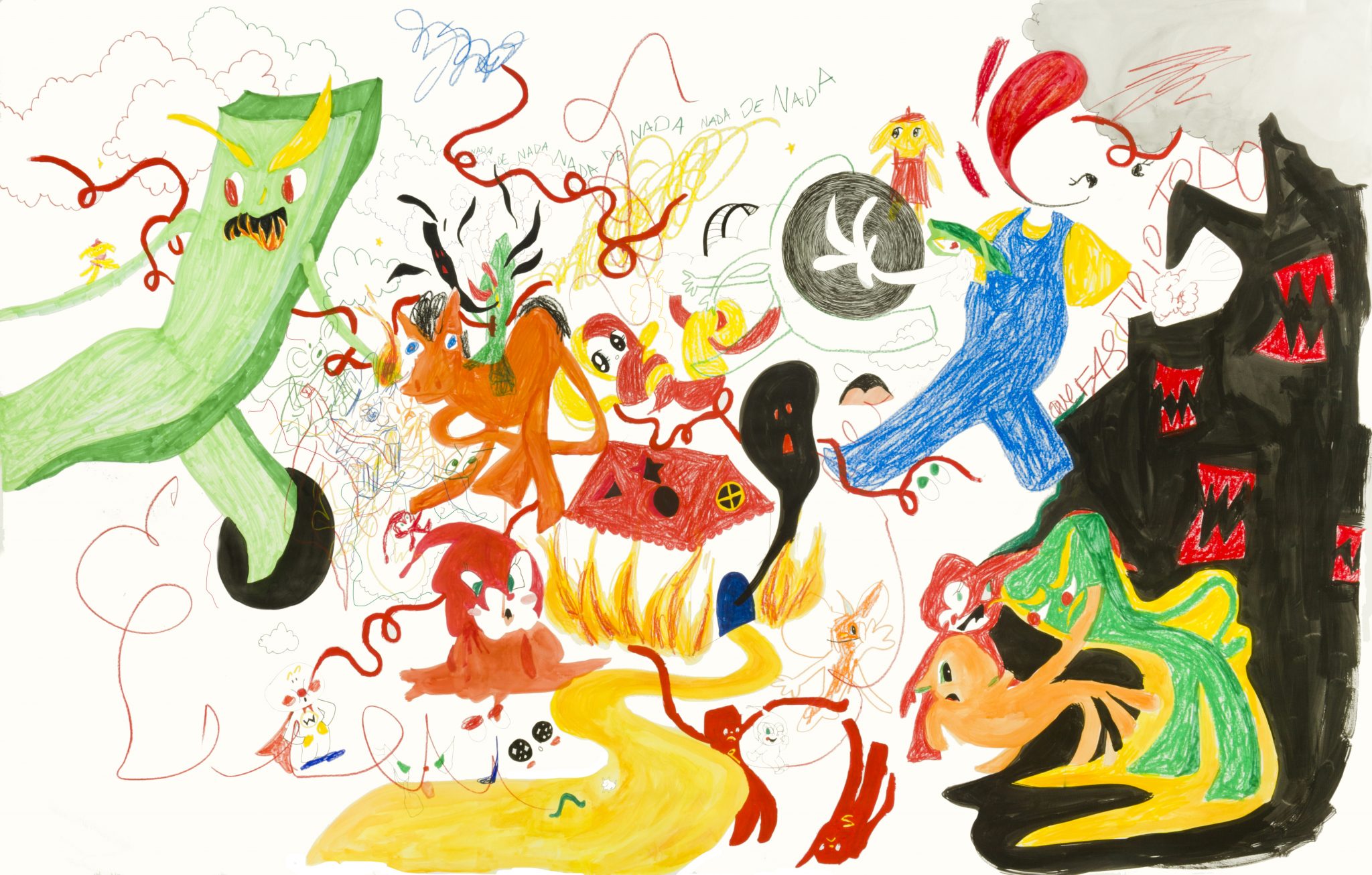 このアート・プロジェクトでは、クレヨン、マーカー、黒鉛鉛筆、色鉛筆、文字など、さまざまな材料を混ぜて使った。