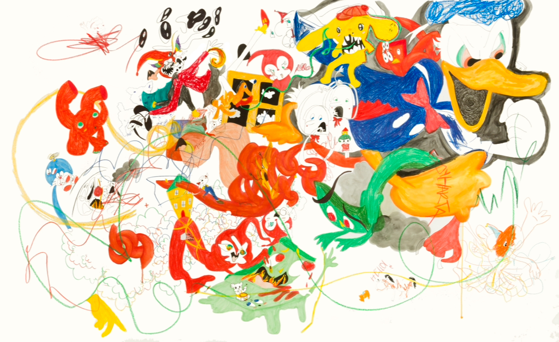 私はカオス、色彩、感覚、並置されたイメージに囲まれて生きることを固く信じている。日本から戻ったとき、この美しい場所で見たもの、感じたものすべてに敬意を表したいと思った。それで、このドローイングのシリーズを作り、1年間取り組んだ。このプロジェクトは『カオスへの宣言』と題されている。