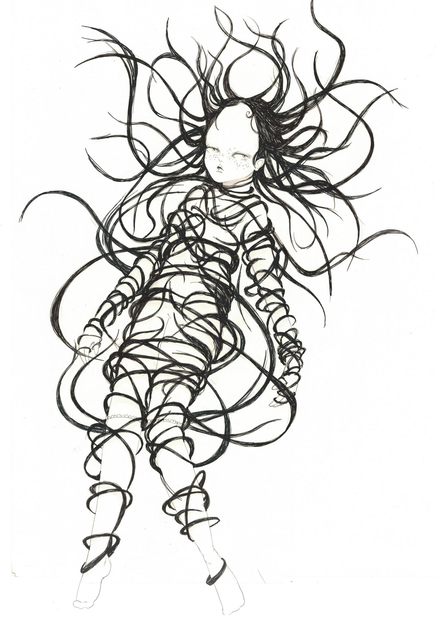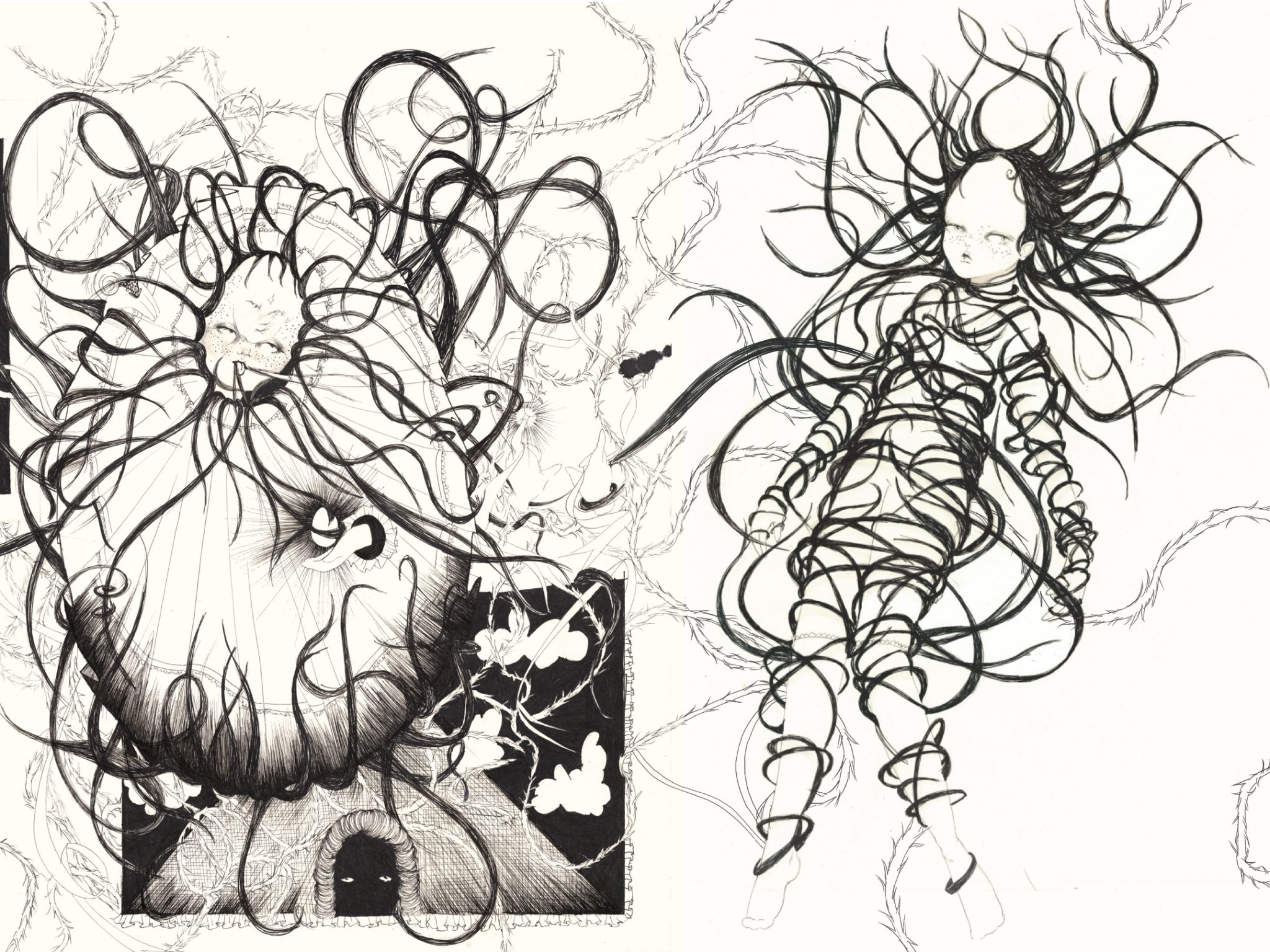 何日も何日も描いているうちに、この物語は、死んだら影と精霊と棘でいっぱいの世界に入り込んでしまう女の子の話だとわかった。