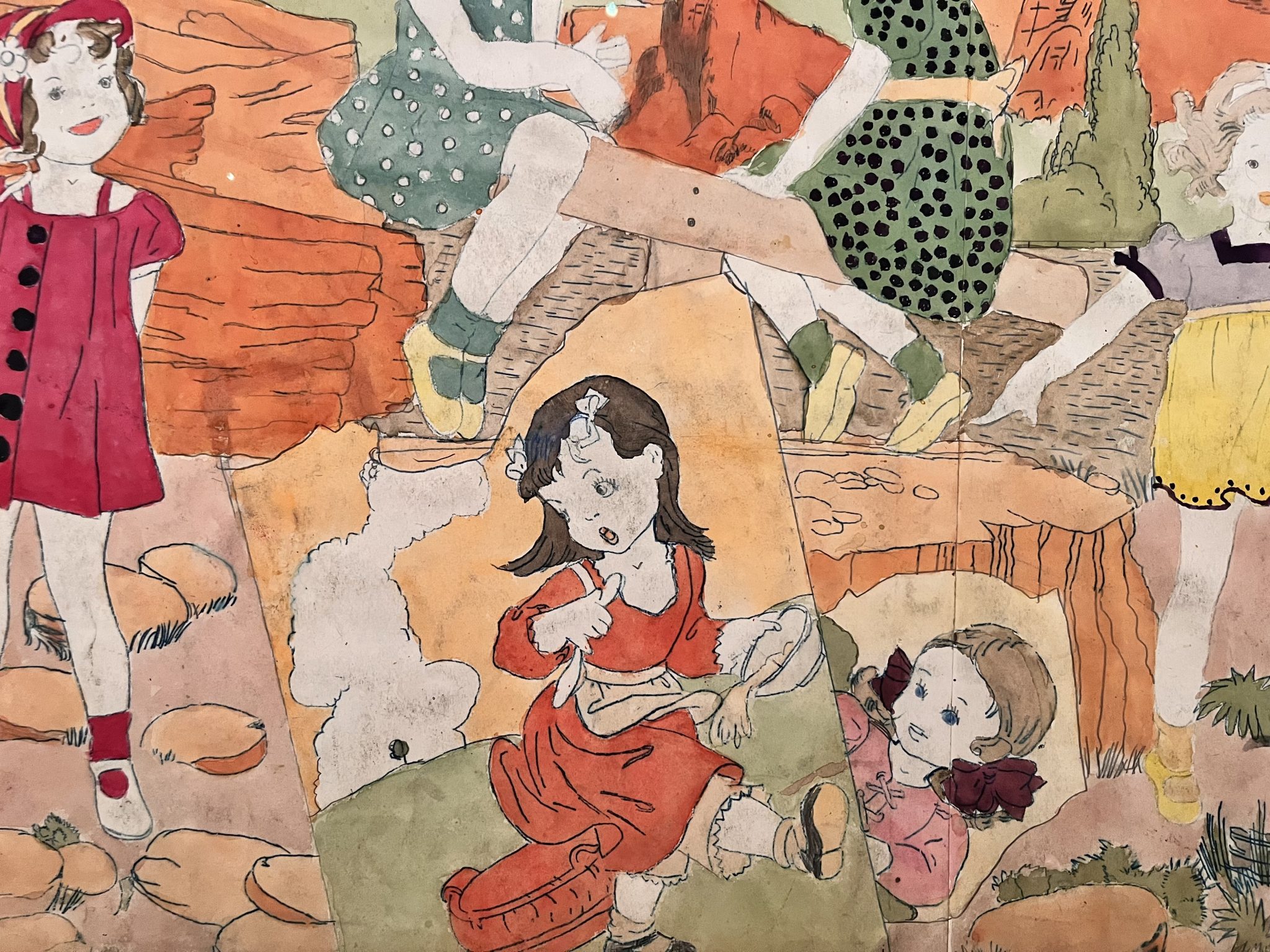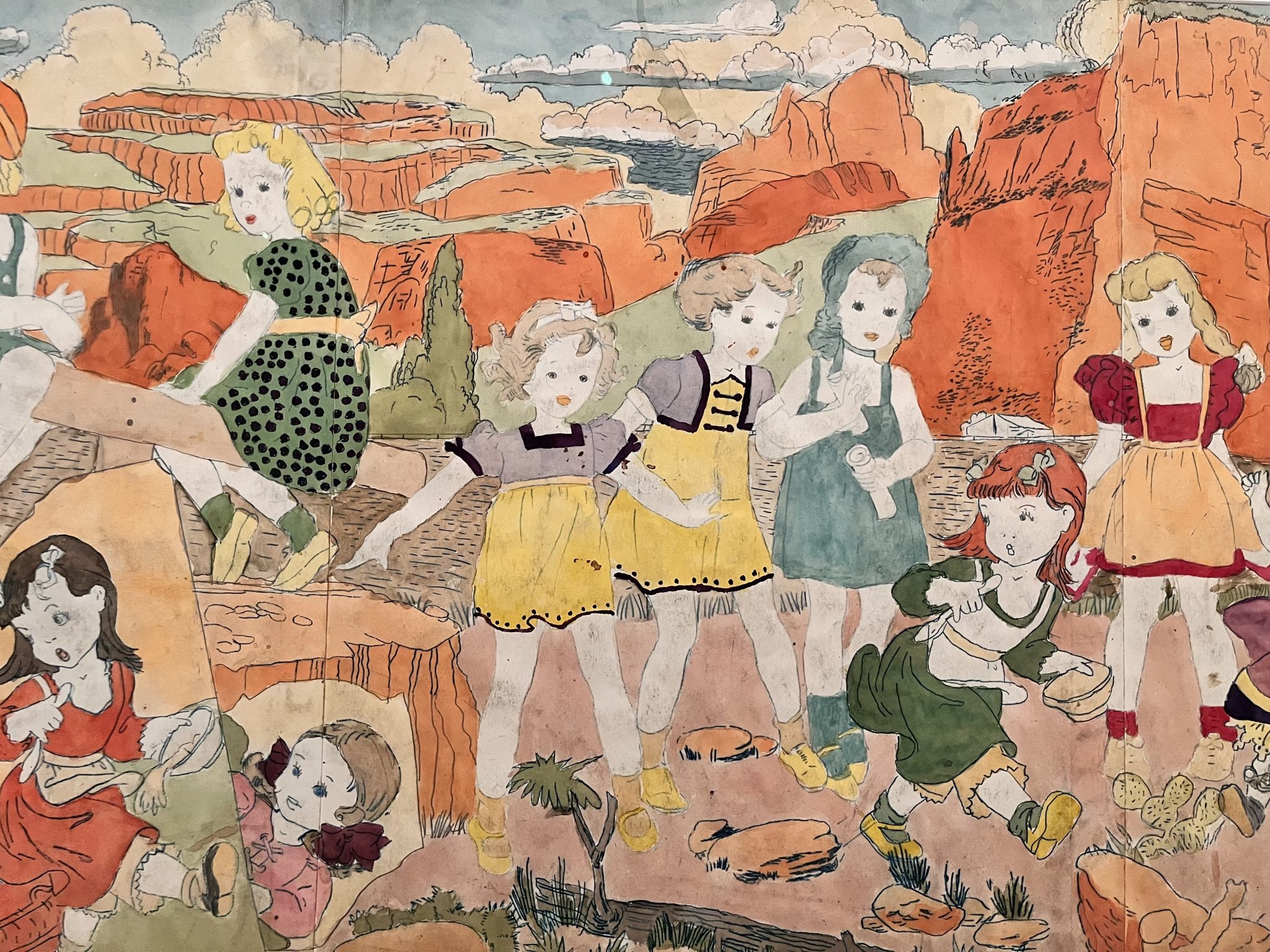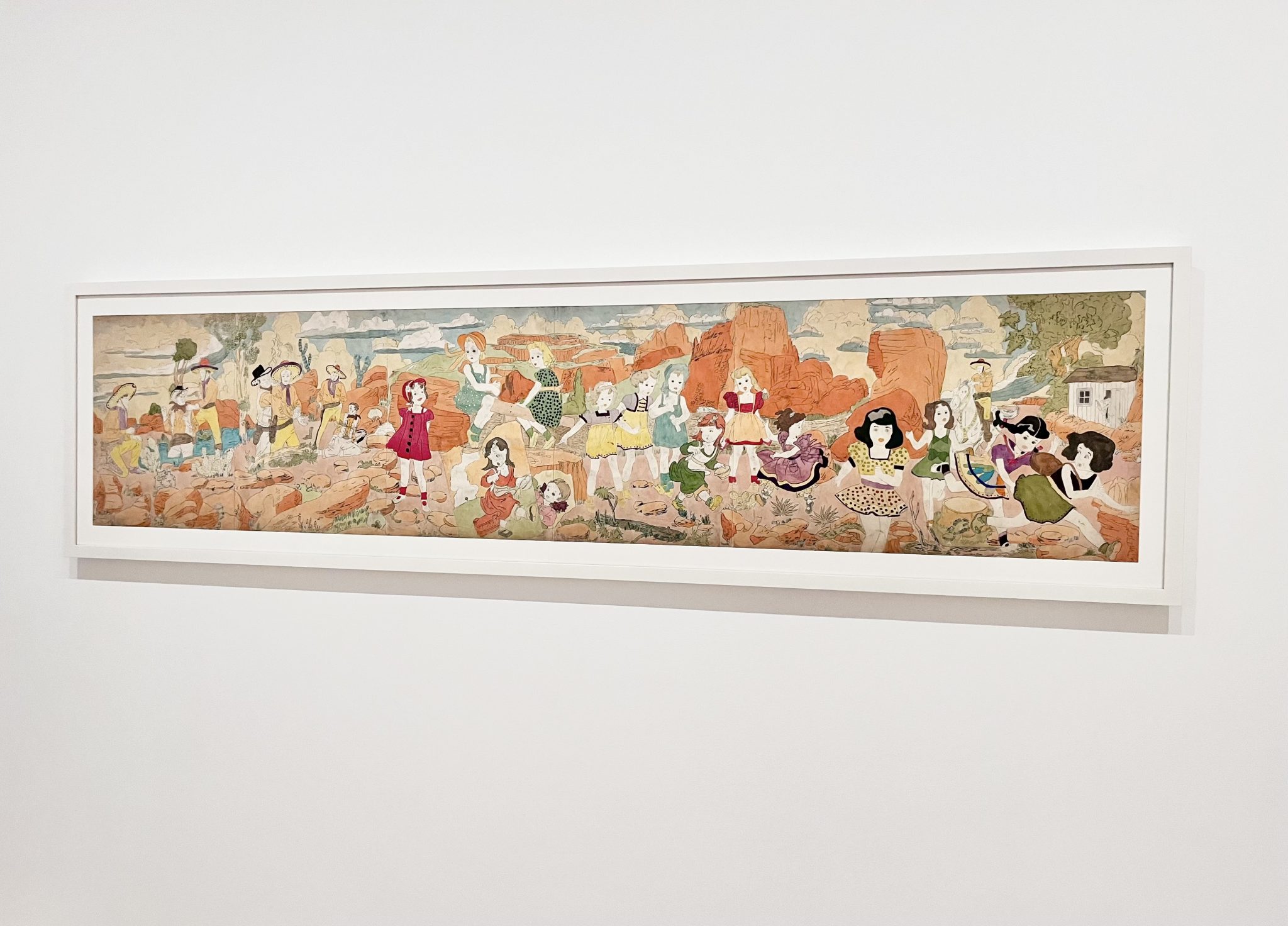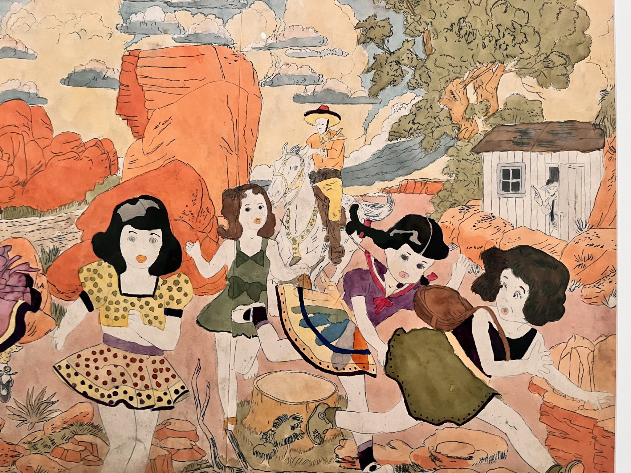 このドローイングはヘンリー・ダーガーのほとんどの作品と同じように無題だが、カウボーイに追われるアメリカ西部劇風の風景の中に少女たちが描かれている。