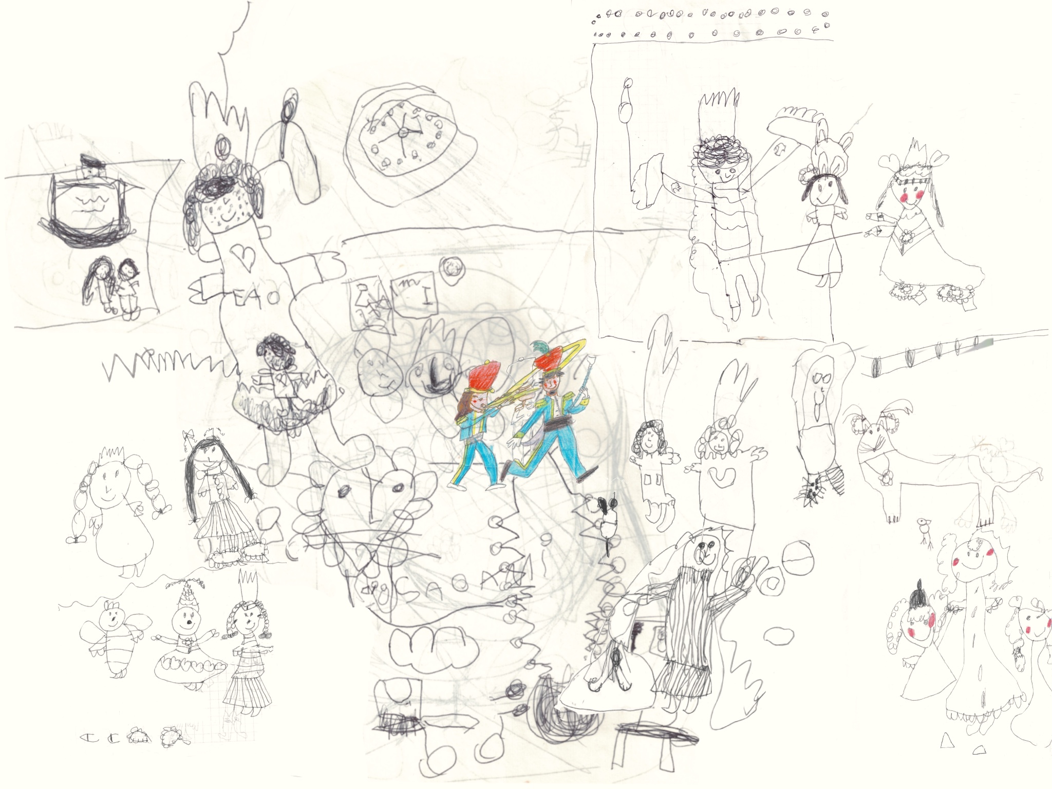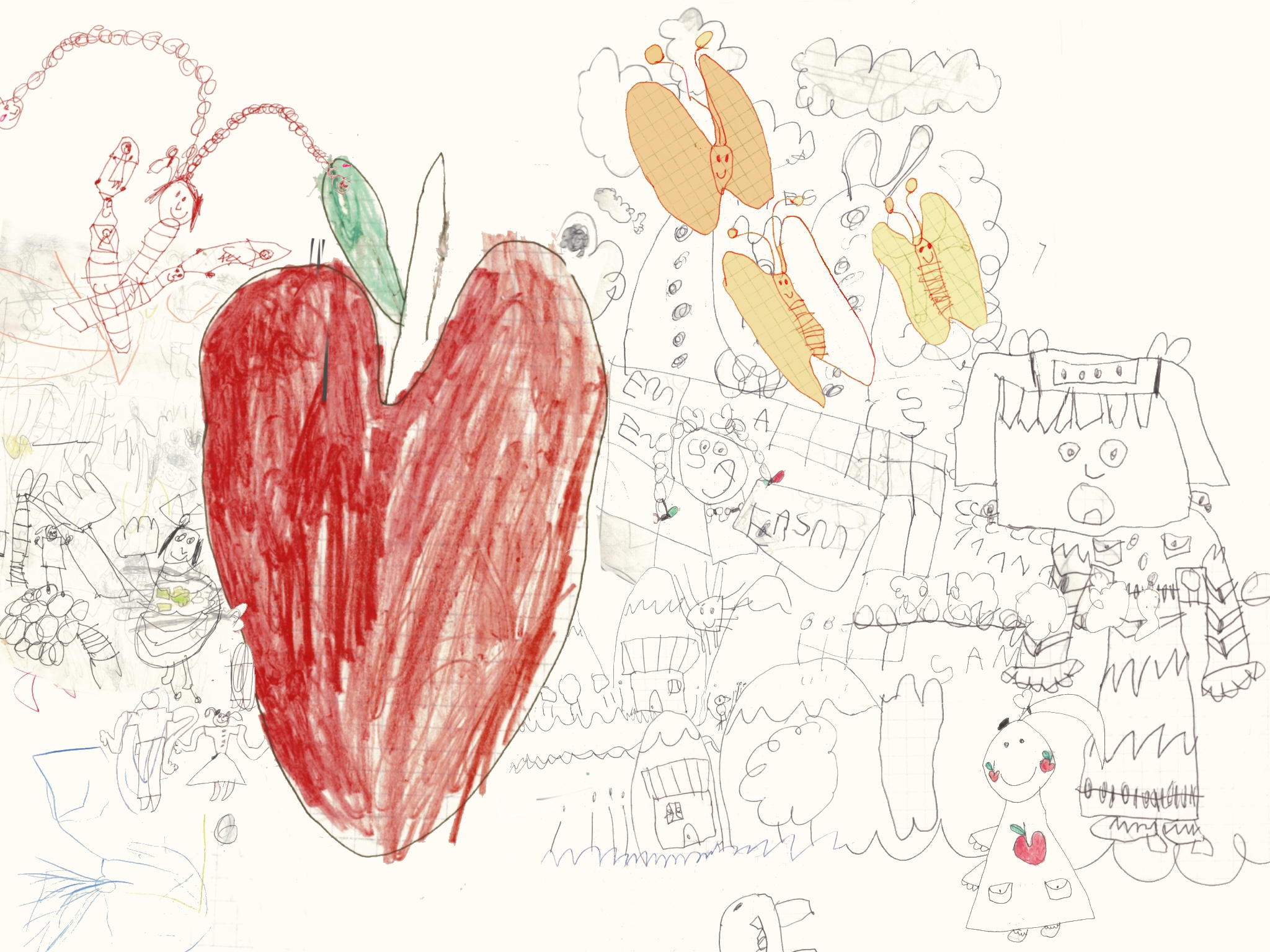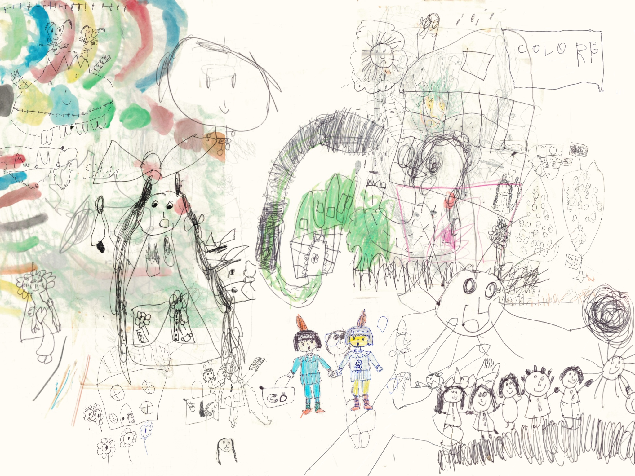 過去の自分を受け入れることは、私にとっては超重要なことだと話したように、自分のアイデンティティをよりよく理解するためには、自分が来た場所を意識することが本当に重要なんだ。私はずっとアーティストで、最近、母が私の子供の頃のスケッチブックをすべて保管していることを発見した。今日は、私が子供の頃に描いたお気に入りの絵を紹介したい。私はスケッチブックを何十冊も持っているので、その中から一番気に入ったものを選び、全部集めて巨大なドローイングのシリーズを作った。だからこれは、私と子供の自分とのコラボレーションなんだ。これらのドローイングは、3歳から7歳の時に一枚一枚描かれたものである。3歳のときに好きだったもののいくつかが今でも好きだと気づくのは本当に特別なことです。素材や色の使用状況に関する類似点もいくつかあります。