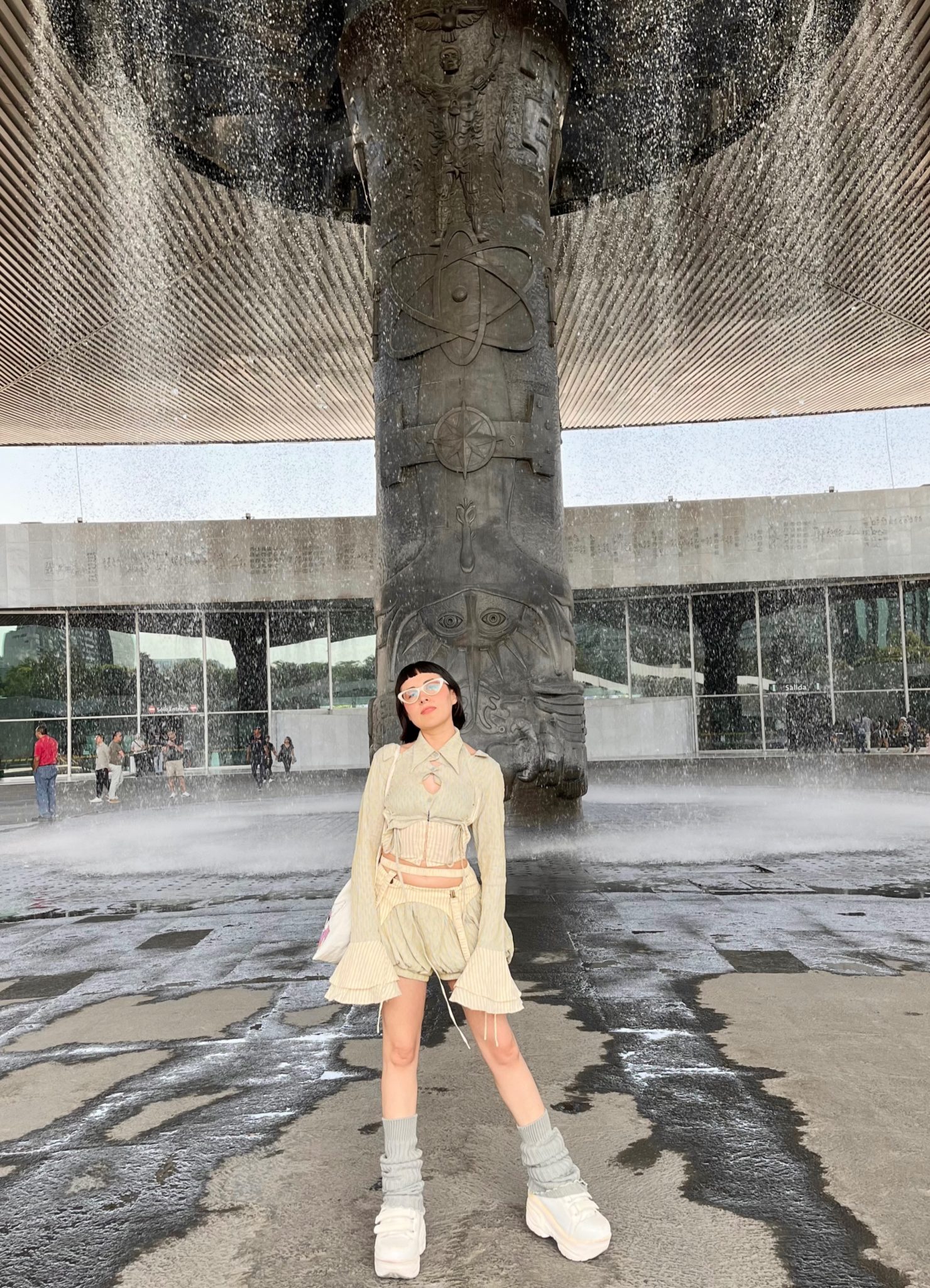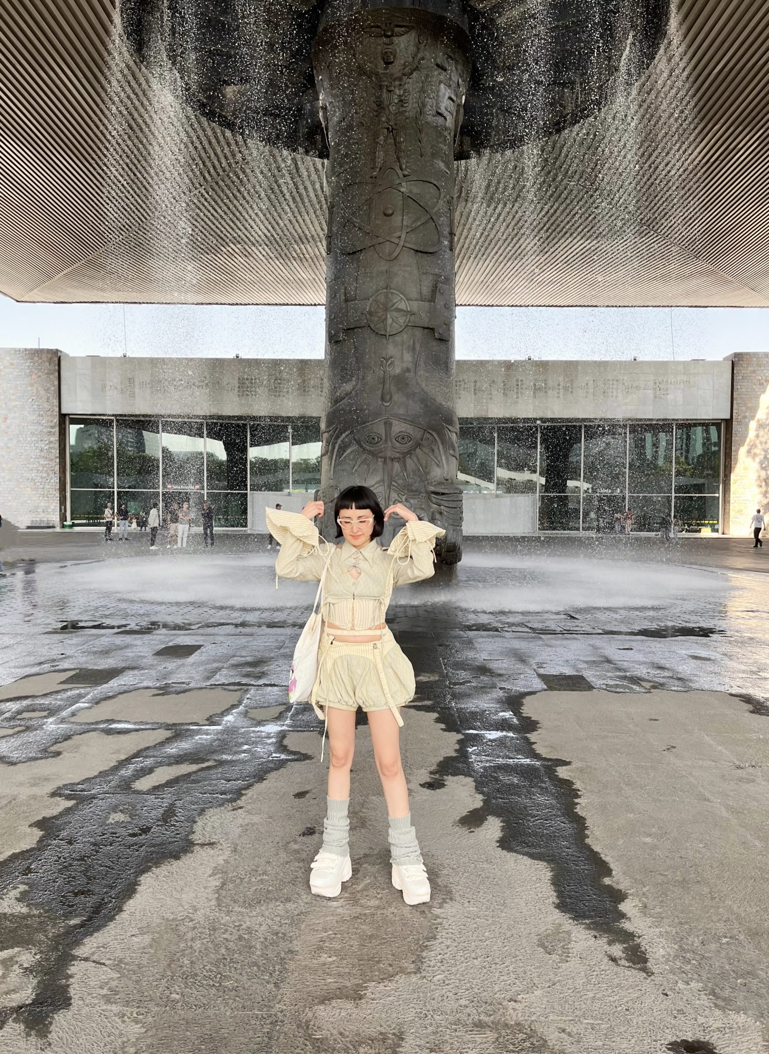今回の訪問では、美術館の色と建築にマッチすると思った特別な服を着ることにした。このトータルルックはClub Series Fight Clubブランドのもので、汎用性が高く楽しいので気に入っている。