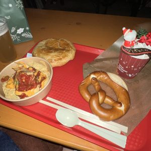 折角クリスマスマーケットに来たからには何か食べたい!ので、ビーフシチューパイとナチョスとプレッツェルを頼みました♡ すごく並ぶかと思っていたけれど進みが早かったです。イートインスペースも沢山あって簡単に座れました!