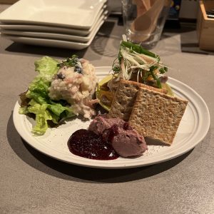 左後ろからポテサラ、砂肝のマリネ、レバームースです。