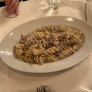 白金豚ラグーとプロシュートコット、マッシュルームクリームのフジッローニ