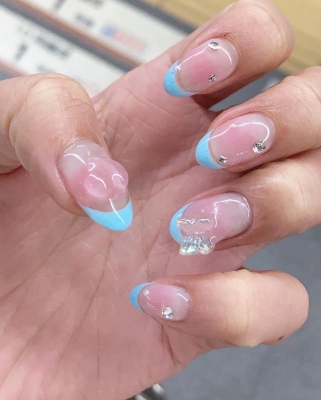チークネイルベースのBlueのフレンチネイル