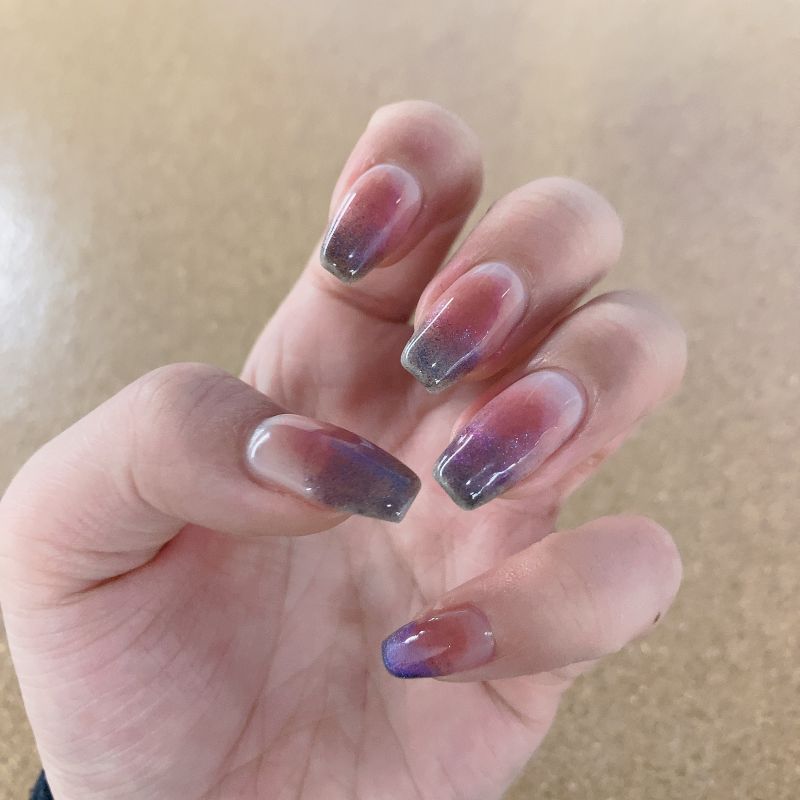 チークネイルにパープルラメの