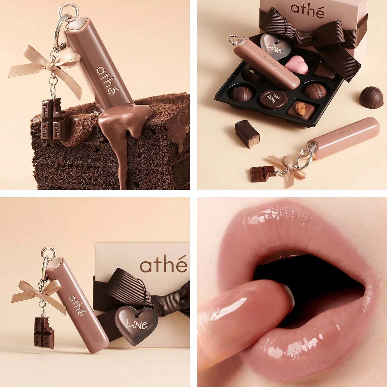 athe(アッテ)の、バレンタインエディションのケースやキーリングが付いたリップがかわいい♡ リップバームの色は10色から選択可能。その中でも、#5MAYや#3CRAVEの2色はブラウン系のチョコレートカラーで特にオススメ♡