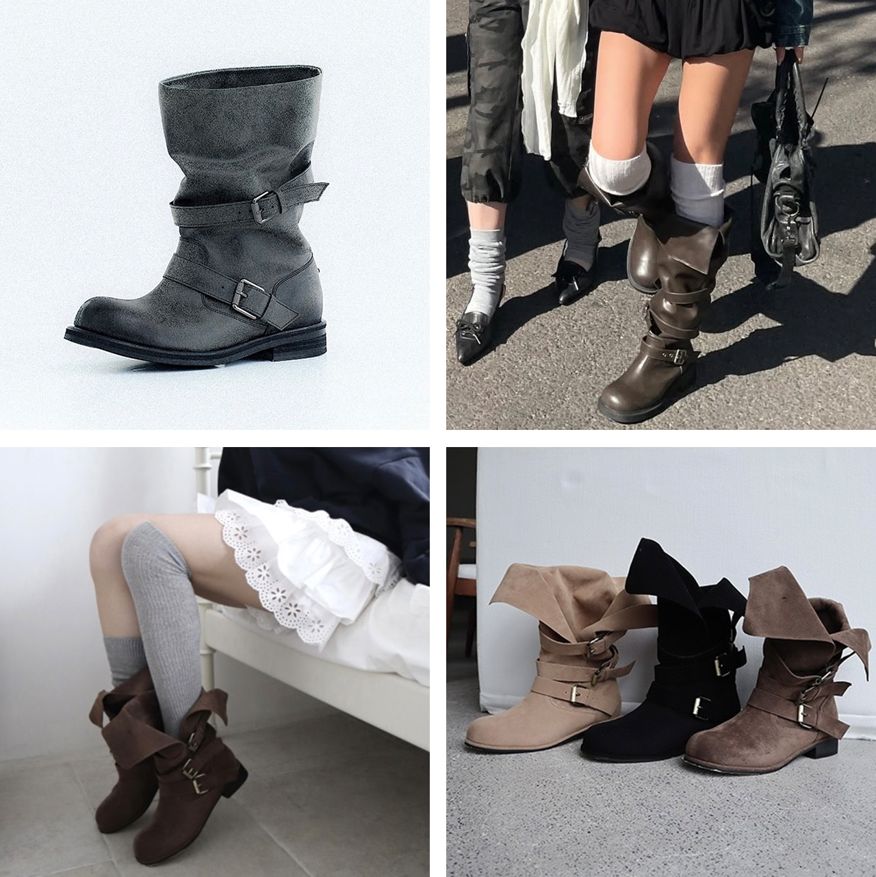 ポインテッドトゥや真っすぐストレートなブーツカバー付きブーツ、ウエスタンムードも人気だけど、ベルト付きのくしゅっとしたごつめブーツはマストバイ♡ あえて甘いスタイリングに合わせたり、カジュアルに合わせたりと、とにかく人気なデザイン!