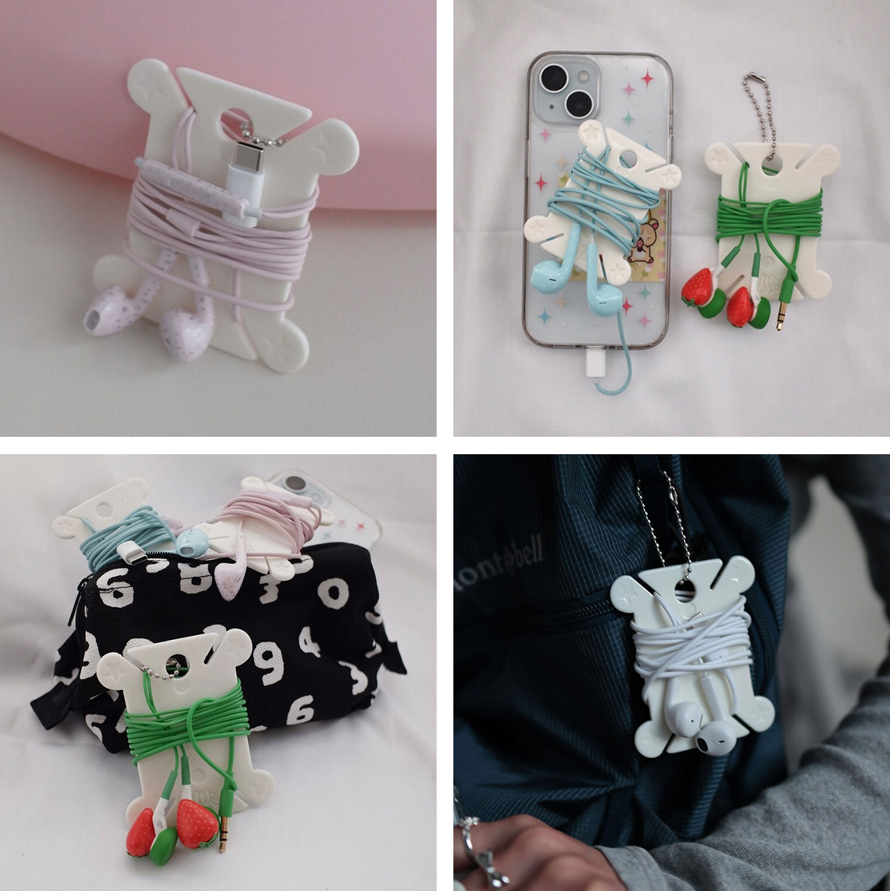 きれいに収納したかったら、m.m.e(エム・エム・イー)のearphone-talaeがおすすめ! 糸や毛糸を巻くようにイヤフォンも巻いちゃうおう♡ キーリングだけじゃなくグリップトックバージョンもかわいい。