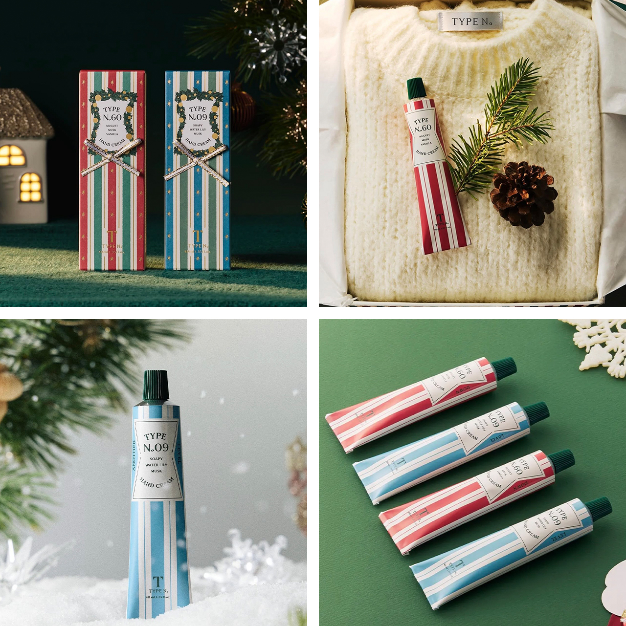 TYPE No.(タイプナンバー)のホリデーエディションは、人気の香りのハンドクリーム2種類が、ホリデー感あふれるデザインとパッケージになって登場♡ すでにプレゼントが決まっている方はTYPE No.をプラスワンしてあげたらもっと喜ばれること間違いなし!