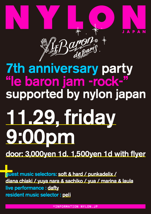 ハイエンドでラグジュアリーなパーティを繰り広げて来たLe Baron de Paris=通称ルバロンと、NYLON JAPANがお送りするスペシャルなイベントが開催決定! ルバロンの7歳、NYLON JAPANの10歳目前(2014年10周年!)をセレブレイトする夢のひととき♡ もともと親和性の高いルバロン×NYLON JAPANとあって、パフォーマー陣もスタイリッシュで個性の強いメンバーがクレジット。7周年デイズの2日目となるこの日は、SOFT&HARD、PUNKADELIX、DIANA CHIAKI、YUYA NARA&SACHIKO、YUA、MARINA&LAULAといったDJ’sから、ライヴパフォーマンスではレーザーハープを駆使して歌う、エレクトリックなショーが話題のDAFTYがオン・ザ・ステージ。お馴染みPELIをレジデントに、”ROCK”をテーマに華やかで非日常的な空間を作り上げる。 冬の夜をホットに彩る、プレミアムな一夜をご堪能あれ♪ 『LE BARON DE PARIS 7 YEARS ANNIVERSARY PARTY “LE BARON JAM -ROCK-”』supported by nylon japan @LE BARON DE PARIS date. 11.29(FRI) open/start. 21:00 acts. SOFT&HARD, PUNKADELIX, DIANA CHIAKI, YUYA NARA&SACHIKO, YUA, MARINA&LAULA, DAFTY, PELI add. 東京都港区南青山3丁目8−40 青山センタービル B1F ※20歳未満の入場は不可です。入場の際は写真付IDの提示をお願いします。 www.lebaron.jp |
