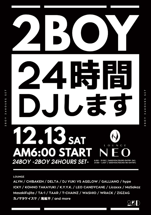 24BOY -2BOY 24HOURS SET- @Lounge Neo add. 東京都渋谷区道玄坂2-21-7 第八矢澤ビル5~6F date. 2014.12.13(STA) open. 6:00