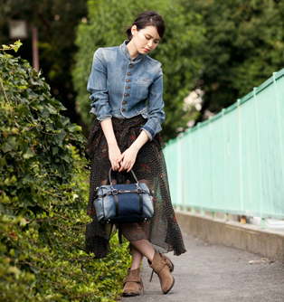 小振りのデニムバックは黒い革ベルトで周り囲み、カジュアルになりすぎず品よくスタイルをブラッシュアップ。ウエスタンのショートブーツで秋っぽくレディな仕上がりに。