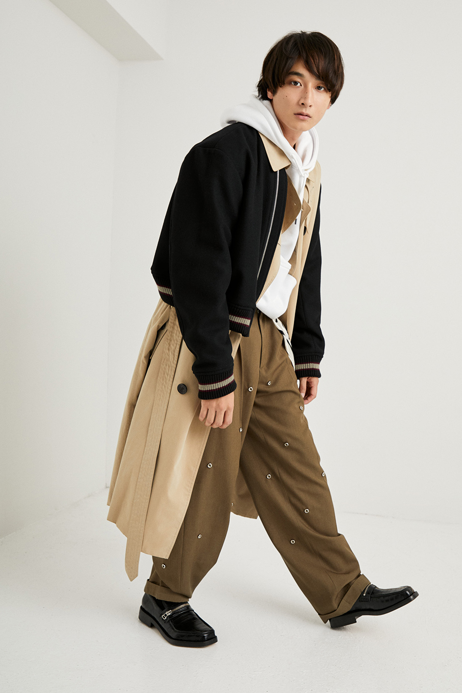 トレンチコート¥141,000(Kazuki Nagayama/スタジオ ファブワーク)、フーディ¥13,000(AVNIER/ジェムプロジェクター)、パンツ¥70,000、シューズ¥108,000(共にMAGLIANO/ディプトリクス)、べルト¥26,000(Children of the discordance/スタジオ ファブワーク)