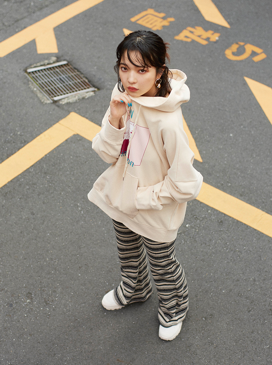 フーディ¥7,000(iCON/ジュンカスタマーセンター)、パンツ¥4,250(Bershka/ベルシュカ・ジャパン カスタマーサービス)、ピアス¥10,000(MONDAY EDITION/ジェム プロジェクター)、スニーカー¥13,800(PUMA/プーマお客様サービス)
