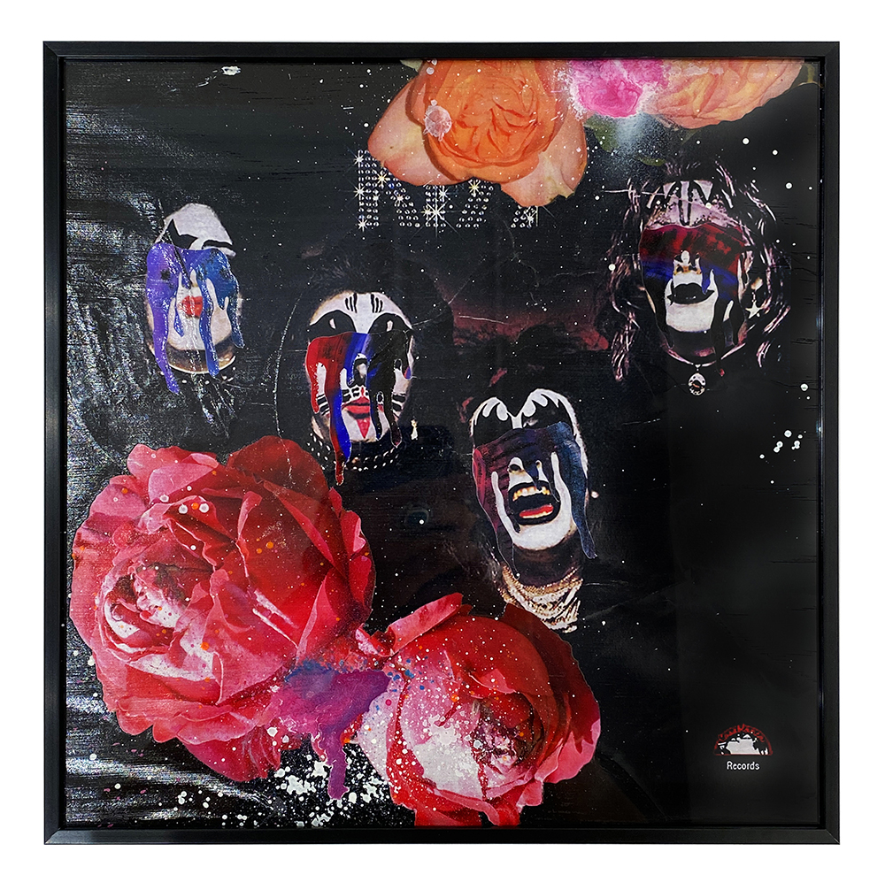 HYSTERIC GLAMOUR デザイナー北村信彦がセレクトしたアルバムジャケットをクラフト紙やキャンバスにプリントし、野島渓がペイントコラージュをしたコラボレーション作品が展示される
