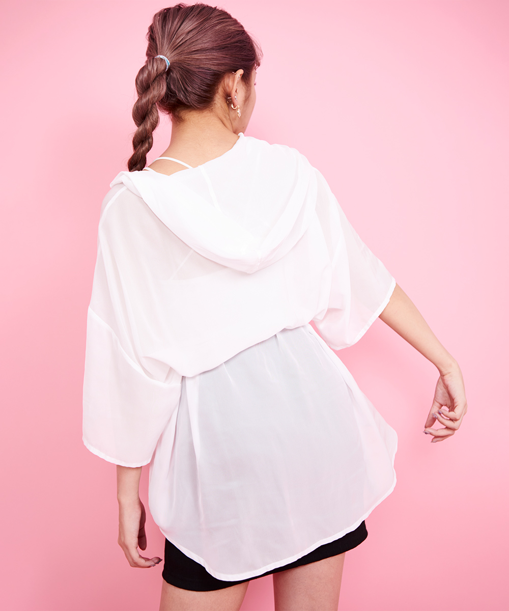 シアー感のあるホワイトシャツは、これからの季節におすすめ。カーディガン風に着てもよし、1枚でも決まる万能シャツ。 |