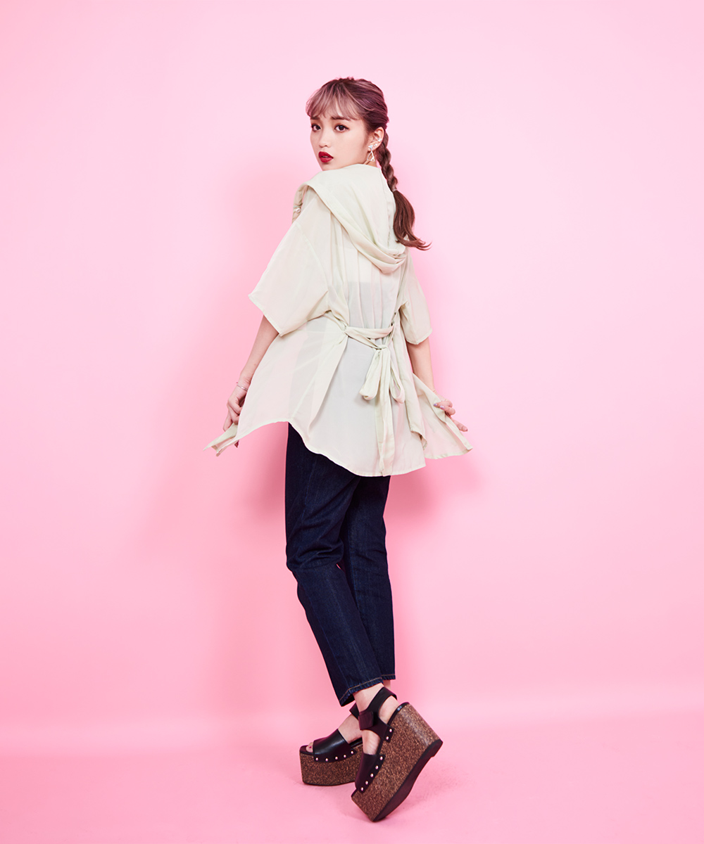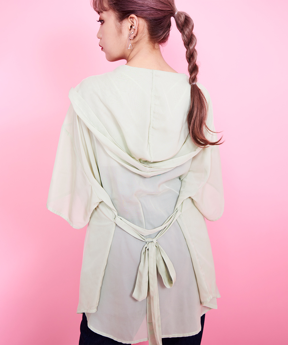爽やかなペールグリーン。腰回りが隠れる丈感なので、スキニーパンツとの相性抜群! 大きめのフードがポイント。 |