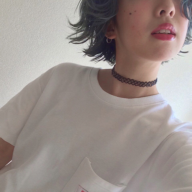 「定番のタトゥーチョーカーは、チャームのないシンプルなデザインが好み。ボーイッシュなコーディネイトにも適度に女性らしさをプラスしてくれる。どんなヘアカラーやメイクにもマッチするからほぼ毎日つけてるよ!」 |
