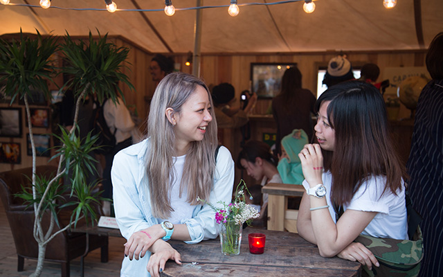 逗子映画祭で行われたBABY-Gプロデュースのワークショップは、コレクションテーマにちなみ、ビーチに作られたテントの中で話題のローリビングフードとコールドプレスジュースの試飲や、ハンドドリップコーヒーを体験できるというもの。大自然の中でゆったりと優雅な時間を過ごすグランピングの魅力に、参加者全員大満足でした。